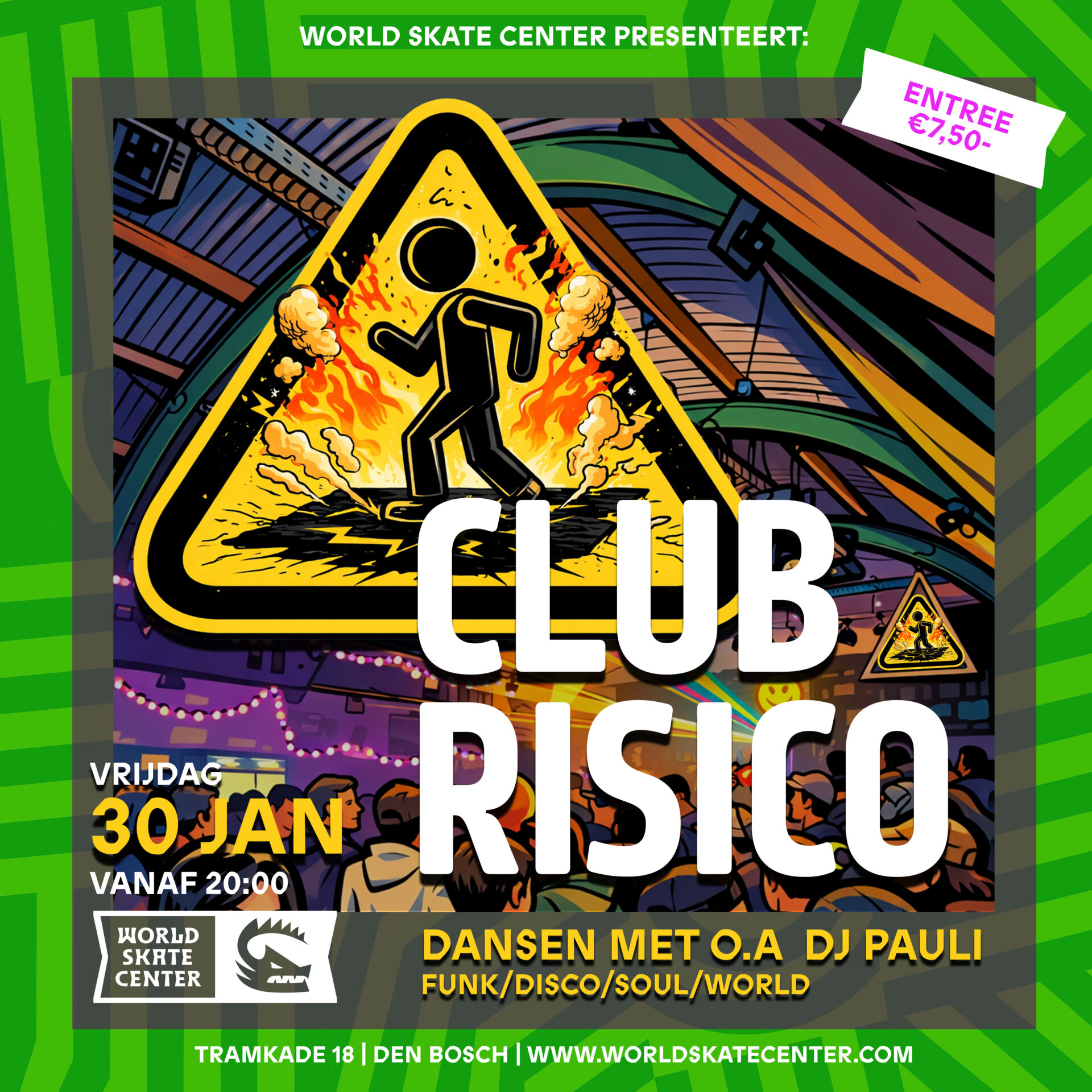 CLUB RISICO Vers van de pers. Een gloednieuwe dansavond waar het risico bestaat dat je niet stil kan blijven staan. Onder andere DJ Pauli komt er voor zorgen dat de dansvloer in onze bar omgetoverd wordt tot een ware club! Met de lekkerste house, funk, disco, soul. Entree €7,50- #clubrisico#dansen#worldskatecenter#tramkade#denbosch Lees meer CLUB RISICO